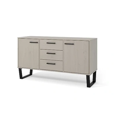 ManoManoGeneral description The Vigo Grey range combines real wood with a rich grey wax and metal to bring a casual industrial styled look to your home. The medium sideboard features simple lines and black stove painted metal legs that blend perfectly with the cabinets, which are finished with a grey washed wax finish, allowing the natural grain and characteristics of the wood to show through. This sideboard, with 2 doors and 3 drawers, serves as a great focal point for your living or dining room while offering versatile storage space. Technical specifications Dimensions: (W) 130.6cm (D) 43cm (H) 73.6cm Material: Solid wood with grey wax finish and metal legs Number of doors: 2 Number of drawers: 3 Compatibility and accessories Adjustable shelves in cupboards Adjustable metal hinges on doors