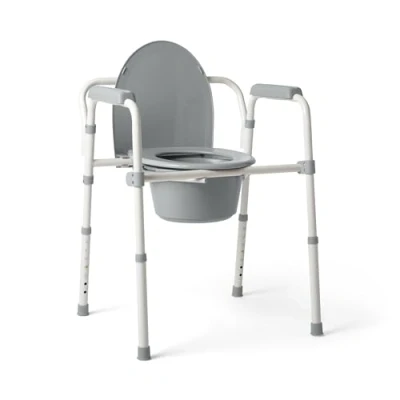3-IN-1 COMMODE DESIGN – Use at bedside, remove bucket and use as a raised toilet seat over a regular toilet, or position frame around toilet seat for sturdy support when sitting down and getting up CUSTOM HEIGHT SETTINGS – Easy push-button design for custom seat height adjustment from 16-22 edit COMFORTABLE SEAT SIZE – Seat measures 14.5” deep, 19” wide and comes standard with seat lid, splash shield and 7.5 qt. bucket with carry handle and lid DURABLE STEEL CONSTRUCTION – Strong, grey powder-coated, steel-welded construction has 350 lb. weight capacity with simple tool-free assembly SPACE-SAVING FOLDING FRAME AND EASY TO CLEAN—Assembled commode measures 22”L x 19”W x 24.5-30.5”H. Commode folds down (25”L x 19”W x 5.7”H) for easy portability; durable plastic snap-on seat makes cleaning quick and easy