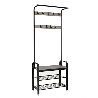 Meerveil Coat Stand, Rack with Shoe Storage Bench, Metal Clothes Rail 9 Removable Hooks, Industrial Style for Hallway Entrance, 72 x 34 183 cm, Grey