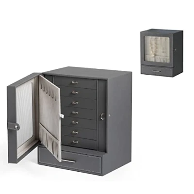 Meerveil Large Jewellery Box, 10 Layer Extra Jewelry Oganiser, Changhong Glass, PU Leather, Storage Box for Necklaces, Earrings, Bracelet Organizer, Gift Girls and Women, Grey