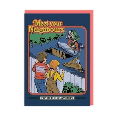 Funny card by Ohh Deer from their 'Steven Rhodes' range. New home, new… drama? Steven Rhodes’ dark-humored design showcases neighbours with questionable yard activities - welcoming, in a bizarre kind of way. Message outside reads: Meet your neighbours. Fun in the community. Blank inside for your own message. Card measures: 150mm x 105mm. Printed in the UK and supplied with a quality envelope.