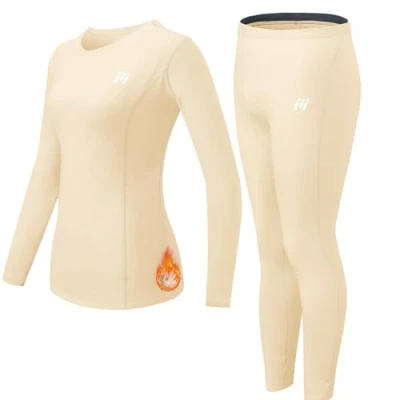 MeetHoo Thermal Underwear for Women, Winter Warm Base Layer Compression Set, Fleece Lined Long Johns Running Skiing Beige