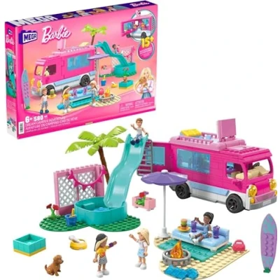 Buildable Barbie Dream Camper includes a roof top bed, TV, interior details featuring a full kitchen 580 bricks include 4 buildable Barbie micro-dolls, 1 pet puppy, fashion and food accessories Building toy comes with a pool with detachable slide, couch, firepit, surfboard and more Pieces combine with all MEGA and Barbie buildings toys, and are compatible with other name brands Ideal for ages 6+, these building toys help to develop creativity and problem-solving skills, Manufacturer: Mattel