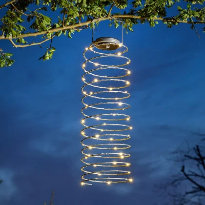 General description This mega spring solar Spiralight lantern makes the perfect fun and stylish addition to any outdoor space. Hanging from a porch, pergola, trellis, or garden crook by the attached handle, this amazing decoration is sure to be the focal point. There are 55 warm white LEDs on a copper wire, wound around the spiral frame of the light. The warm glow shines out, casting a beautiful decorative light into the surrounding area. The solar panel charges throughout the day using the sun’s energy, and the clever little light sensor automatically illuminates the LEDs at dusk to add a glow to your evening BBQs and summer soirees! Technical specifications Dimensions: 62cm (H) x 16cm (W) Number of LEDs: 55 Power source: Solar-powered Installation No wiring required Simply place in a non-shaded area Leave to charge in the Off position for two days