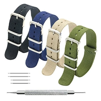 Amazon 4/8 PACKS for DAILY USE: Different combinations of 4/8 colors, use different watch straps for different occasions and outfits every day. It takes only a few seconds to get a new look. A variety of color combinations are available. The actual object is consistent with the picture. QUALITY MATERIAL: The MEGALITH nato strap is selected high-quality nylon with a stainless steel buckle. The nylon material is waterproof and sweatproof, and it can keep comfortable and breathable even if it fits the wrist for a long time. Our straps are machine washable, the color is firm and does not fade, and they are resistant to wear. WIDTH SELECTION and ADJUSTABLE LENGTH: Available in 10 inches in length and 5 size in width ( 16mm, 18mm, 20mm, 22mm, 24mm ) to fit thousands of watch models. To select width, measure width of watch lug or width of current band at connection point and then select width closest to measurement. If the band is longer than desired, you can adjust the length or change the way you wear it according to our watch strap manual. EASY TO INSTALL: We provide 1 high quality spring bar tool and 4 neighboring size stainless steel spring bars for you to change your watch band, you will know how to switch between different watch bands and how to find the best way to wear our watch bands. PURCHASE WITHOUT WORRY: Each MEGALITH watch band comes with a 12-month warranty. Though our watch bands guaranteed to fit nearly all men and women, if you still think it did not fit as expect, or you have any other dissatisfaction, please feel free to contact us on Amazon.