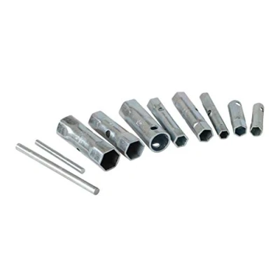General description Box spanners are thin, long tools designed to tighten or loosen bolts and nuts in narrow spaces. They are commonly used in plumbing maintenance and automotive repair. Made from bright plated steel, these tubular box spanners can accommodate a tommy bar for added leverage. The set includes multiple sizes suitable for various applications, including a spark plug spanner. Technical specifications Set includes 8 pieces with sizes: 9 mm, 10 mm, 11 mm, 12 mm, 14 mm, 17 mm, 21 mm, and a 14 mm spark plug spanner. Lengths range from 50 mm (2 inches) to 82 mm (3.1/4 inches). Size range: 8-22 mm. Double-ended spanners for most sizes, with single-ended options for some. Compatibility and accessories Designed to fit bolts and nuts within the specified sizes. Compatible with a tommy bar for increased torque. Installation No installation required; tools are ready to use straight from the set. Usage Use the appropriate size spanner to tighten or loosen fasteners in tight or