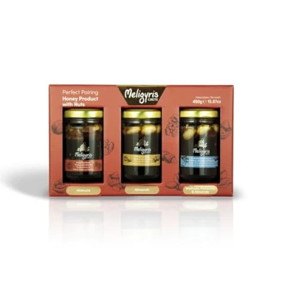 AUTHENTIC CRETAN HONEY – Premium pine honey sourced from the mountains of Crete, crafted by Meligyris, a traditional Greek family beekeeping estate with generations of expertise. THREE UNIQUE HONEY & NUT COMBINATIONS – Includes: Pine Honey with Walnuts Pine Honey with Almonds Pine Honey with Walnuts, Pistachios & Almonds A perfect trio for tasting and pairing. 100% NATURAL INGREDIENTS – Made with pure Greek honey and whole nuts. No additives, no artificial flavours, and no preservatives — just natural sweetness and wholesome crunch. PERFECT FOR BREAKFAST & SNACKING – Enjoy with yoghurt, cheese, oats, bread, pastries, or straight from the jar. A flavour-rich superfood packed with nutrients and energy. IDEAL GIFT PRESENTATION – Arrives in a premium gift box, ready for gifting. A thoughtful choice for food lovers, honey enthusiasts, or anyone who appreciates Mediterranean delicacies.