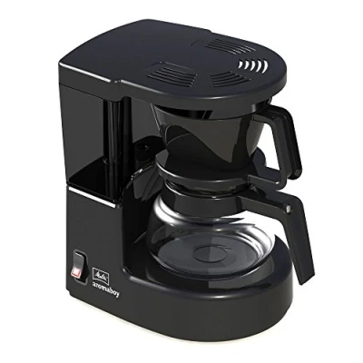 AmazonCompact and stylish filter coffee machine with transparent water tank and cup level markers, Makes 2 cups of coffee at a time Optimal brewing temperature for full aroma development and the ideal cup of coffee Space-saving design, With its space-saving design, the Aromaboy is guaranteed to fit into even the smallest kitchen The removable filter holder and glass jug are dishwasher safe to ensure convenient cleaning, Switches off automatically 40 minutes after brewing Contents: 1 x Melitta Filter Coffee Machine, Aromaboy Model, Stainless Steel, Black, Art.No. 6707286, Weight: 1.7416518698 pounds, Manufacturer: Melitta