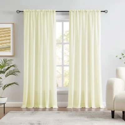 SOLD IN PAIR: Package includes 2 panels of cream/light yellow semi sheer voile curtains, each panel measures 52"W x 63"L (total 104" width for 2 panels). Length measures from the top curtain hem to the bottom. SOFT VELVETY MATERIAL: Well made of luxury velvety textured fabric, premium cotton blended material make the sheer curtains silky in look and soft to touch. Curtain surface has a charming sheen, adding a chic and concise sense to your windows. LIGHT FILTERING: Thanks to the high density natural cotton material, our semi sheer curtains can block out about 30% light, not too see through while still smartly invite sunlight to come through, creating an airy and breathable interior environment. Versatile for all sorts of rooms and occasions, like home and office window decoration, hotel rooms, weddings and celebrations etc. SUITABLE MATCH: Constructed with 1.6” inner diameter rod pocket and 1.2" long header hem. Can be hung separately, or arrange in pairs with blackout curtains in Melodieux. Very suitable for bedroom, living room, dining room, bay windows, or work as the solid backdrop for parties. EASY CARE: Machine washable with laundry bag or dry clean, gentle cycle, do not bleach, tumble dry low. Wrinkles will be removed after hanging for weeks or iron under low temperature. Any questions just feel free to contact us, and we will try our best to help you.