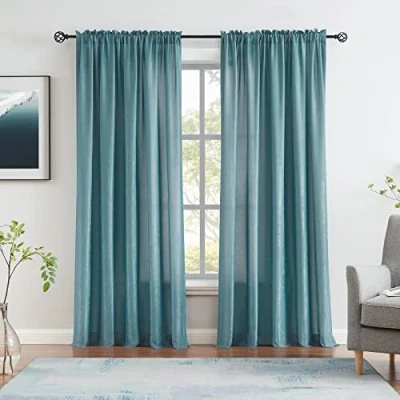 SOLD IN PAIR: Package includes 2 panels of teal semi sheer voile curtains, each panel measures 52"W x 96"L (total 104" width for 2 panels). Length measures from the top curtain hem to the bottom. SOFT VELVETY MATERIAL: Well made of luxury velvety textured fabric, premium cotton blended material make the sheer curtains silky in look and soft to touch. Curtain surface has a charming sheen, adding a chic and concise sense to your windows. LIGHT FILTERING: Thanks to the high density natural cotton material, our semi sheer curtains can block out about 30% light, not too see through while still smartly invite sunlight to come through, creating an airy and breathable interior environment. Versatile for all sorts of rooms and occasions, like home and office window decoration, hotel rooms, weddings and celebrations etc. SUITABLE MATCH: Constructed with 1.6” inner diameter rod pocket and 1.2" long header hem. Can be hung separately, or arrange in pairs with blackout curtains in Melodieux. Very suitable for bedroom, living room, dining room, bay windows, or work as the solid backdrop for parties. EASY CARE: Machine washable with laundry bag or dry clean, gentle cycle, do not bleach, tumble dry low. Wrinkles will be removed after hanging for weeks or iron under low temperature. Any questions just feel free to contact us, and we will try our best to help you.