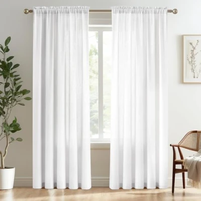 Melodieux White Semi Sheer Curtains 84 Inches Long for Living Room Linen Look Bedroom Rod Pocket Voile Drapes, 52 by Inch (2 Panels)