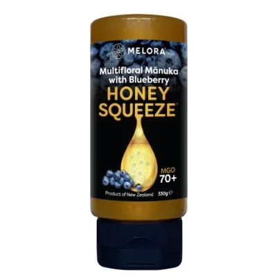 Squeezy 100% Certified & Pure New Zealand Manuka With Blueberry! The powerful flavour of Manuka honey combined with blueberry extract to create the perfect honey for your breakfast table. Use Melora Mānuka Honey to give yourself an extra bounce by making it part of your daily routine: Perfect for all the family, to drizzle on pancakes, waffles, porridge, in salads, in hot drinks or for that perfect dressing. Or just straight off the spoon. Why Manuka? High levels of methylglyoxal (MGO) and hydrogen peroxide give manuka honey superior antimicrobial and anti-inflammatory properties. Moari Remedy: Manuka Honey is known for its antibacterial activity, this traditional Moari Manuka Honey has many uses for soothing coughs, sore throat, oral hygiene, promote skin healing. Straight From Source: Our honey can be traced back to the land from which it's sourced, allowing us to guarantee quality and authenticity