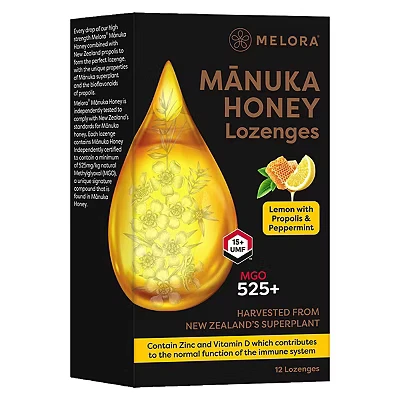 Melora High Strength Manuka Honey Lozenges 525+ MGO UMF 15 with Propolis Naturally Soothing for Sore Throat Relief and Immunity Lemon & Peppermint Flavour Pack of 12 (48g)