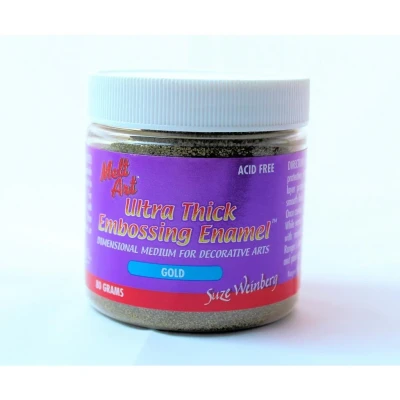 Ultra Thick Embossing Enamel (UTEE) from Suze Weinberg is a specially formulated, large particle embossing powder used as a dimensional medium for decorative arts. Use a heat tool to produce textured embossing. Pour into moulds to create 3D artefacts or dip to coat a variety of objects. Acid-free 80 grams of gold UTEE This container of UTEE is approx 6cm tall and 6cm in diameter with a screw top S09306 MPN SUZ09306