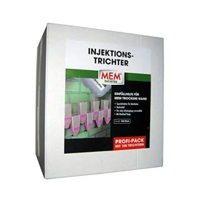 Provides with MEM dry wall for a high-quality horizontal barrier layer against rising moisture in the wall for permanently dry rooms. . Can be used in all common masonry such as concrete, sand-lime brick, etc. For damp and dry masonry indoors and outdoors. Easy to use: remove loose plaster etc. and fill cavities with MEM borehole washers, attach and clean drill holes using the instructions, insert injection funnel and fill with dry wall until saturation Package Content: 1 x MEM injection funnel set, Contents: Pack of 100. Item number: 30836250 International products have separate terms, are sold from abroad and may differ from local products, including fit, age ratings, and language of product, labeling or instructions., Weight: 4.40924524 pounds, Manufacturer: MEM