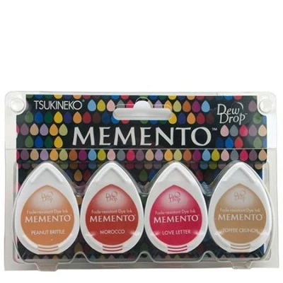 Memento 4 Piece Set Golden Sunset. Memento dye ink is fast drying and fade resistant. The innovative pad delivers finer impressions and exceptionally even coverage.. Application - Coated paper, vellum, uncoated paper, printer paper. Drying time - 3 to 5 seconds on coated paper. Virtually instant on uncoated papers. Varies based on surface / material, humidity, etc.. Particularly for glossy vellum and coated paper are suited for reproducing fine detail and lines.. Dries very quickly for regular paper like New Years Greeting post cards and schedule stamps.. Brilliancy of the ink is more obvious than regular dye ink resist for water and light.. Memento Dew Drop is suited for colouring the boarder lines and fine detail art works.. Can be used with ink blender for shading and spray effect. *please refer to ink blender.. It is possible to mix with inker.. L size Memento comes with the sticker on side of the cover for easy identification. MD-100-016