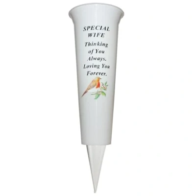Memorial Grave Flower Pot 33cm tall Sturdy White Graveside Vase with Spike and Robin Image (Special Wife 8781)