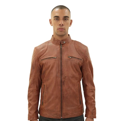 Men's Brown 100% Real Leather Moto Racing Biker Fashion Motorcycle Zipped Jacket L