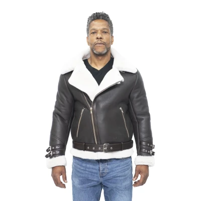 Men's Brown Retro RAF B3 Pilot Real Sheepskin Shearling Biker Leather Jacket 5XL