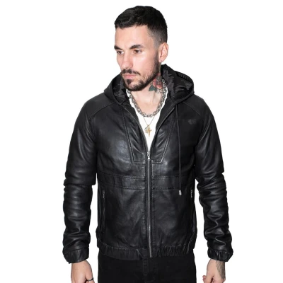 Men's Casual Black Nappa Leather Biker Jacket with Hood XL