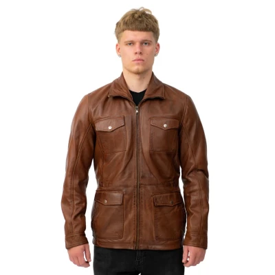 We use our ultra-soft premium Nappa leather here to create a jacket inspired by the classic safari style which burst onto the fashion scene around the late 40s. As is traditional for the style, this coat features four-pointed flap pockets positioned at the waist and breast and a tabbed YKK zip fastening which extends up to a high stand collar. For a more relaxed look the collar can be left open to feature like a cutaway style. This jacket appears in an earthy timber which is a great colourway for cooler weather and features particularly well in the autumn. • 100% premium ultra-soft nappa leather • Four external flap pockets with press button fastening • Shirt Style collar • Features a full length YKK zip and two interior pockets • Retro safari style theme