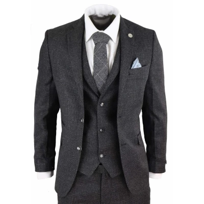 Sharp, sleek and sophisticated, look the part with this premium 3 piece black tweed suit. A vintage design worn by the Shelby brothers from the Peaky Blinders gang, this retro tweed peaky blinders suit has been tailored from a luxury Italian wool blend. Complete with blazer, waistcoat and trousers, this suit will have you looking sharp and suave wherever you go, no matter the occasion or event. A longstanding fashion icon dating back to the 19th century, this vintage tweed suit is a perfect addition to any man's wardrobe, a smart and sophisticated outfit for whenever you need that extra bit of style and class to your outfit.