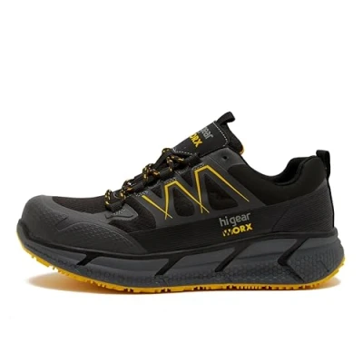 BlacksFrom our brand new collection Hi Gear Worx, the Men's Fuze Trainer has a hybrid design that offers the comfort of a trainer with the safety features of a work boot. With features including a composite safety toe, a slip resistant outsole and speed locking eyelets, these shoes are super practical and comfortable, allowing you to focus on your work. The boots are constructed with a fully non-metal design, as well as a synthetic upper that's durable, flexible, and breathable. Fully non-metal design Composite safety toe Non-leather upper Ergonomic lightweight insole Contrast outsole - slip and oil resistant Mesh collar Vegan friendly Speed locking eyelets