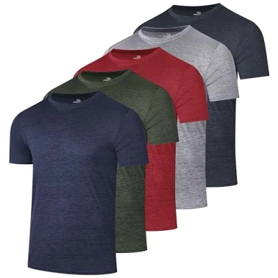 5 PACK MEN'S CREW NECK TEES – Athletic workout tshirts for men in solid colors. Gym, running, sports, or casual everyday wear essentials MOISTURE WICKING QUICK DRY – Polyester spandex blend pulls sweat away. Stay cool during workouts, hiking, golf, and outdoor activities 4-WAY STRETCH & COMFORT – Lightweight breathable tag-free crewneck with soft feel. Non-restrictive fit for exercise, training, and sports VERSATILE ACTIVEWEAR TOPS – Great as gym shirts, undershirts, casual tees, or layering. For men in sizes small to 3XL EASY CARE & GREAT VALUE – Machine washable, wrinkle-free, no shrinkage. 5 tee shirts per pack in your choice of color sets