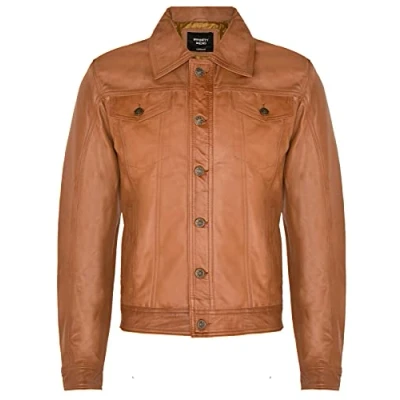 Men’s Smooth Casual Tan Trucker 100% Leather Shirt Jeans Jacket M