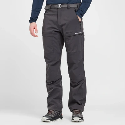 Whether you're hiking, mountaineering, or scrambling, these versatile pants are up for the challenge. Pre-articulated knees and a gusseted crotch provide freedom of movement, while mesh-lined thigh pockets and deep hand pockets keep your essentials close. Perfect for colder climates, the Terra XT Pants are the new and improved version of the best-selling Super Terra Pants, ready for any mountain pursuit. Durable Granite and Granite Hydro fabrics with PFC-Free DWR finish Reinforced seat, knee, and instep - For enhanced durability Pre-articulated knees and gusseted crotch - For maximum freedom of movement Mesh-lined thigh pockets and deep hand pockets - For convenient storage Brace hooks compatible with Montane braces Gaiter hook on front trouser cuff and press stud ankle adjustment Pre-elasticated microfleece-lined waistband Zipped fly with press snap and button closure Removable webbing belt Zipped rear pocket for quick access to essentials Ideal for hiking, mountaineering, and scrambling in colder climates Technology: Main - Granite 272g/m2 97% Nylon 3% Elastane fabric with PFC-Free DWR Coating Reinforcement - Granite Hydro 97% Nylon 3% Elastane with PFC- Free DWR Coating Fabrics: Main: 97% Nylon, 3% Elastane; Reinforcement: FACE: 97% Nylon, 3% Elastane, BACKER: 100% Polyester