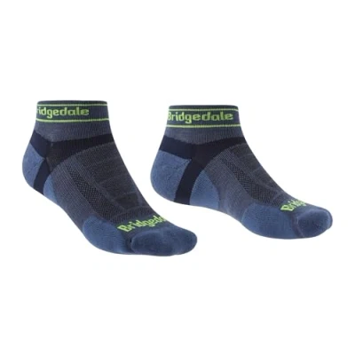 Bridgedale Men's Ultra Light T2 Merino Sport Low Socks are ideal for trail running as they come with T2 micro-cushion protection to absorb impact and reduce the chance of blisters. These well-ventilated socks are designed to keep your feet cool and dry in warmer conditions. The low sport fit provides supportive compression around the ankle to improve stability while the non-slip cuff prevents dust and debris from making its way inside as you attack the trails. Key areas of the foot are supported by ShockZones padding and a flat toe seam helps prevent the kind of bunching that can cause discomfort when running up and down hilly terrain. Lycra fabric construction and ThermoFit technology ensure that these socks return to their original shape and size after every wash. Performance trail socks Low fit (sport) Fabric: 64% nylon / polyamide, 33% merino wool, 3% Lycra / elastane Moisture management ThermoFit Flat toe seam Toe guard T2 AntiShock cushioning ShockZones Overfoot ventilation Zero debris cuff Natural toe spread Y-Heel Colour: Blue