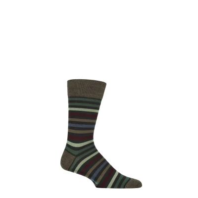 High quality men’s socks in a winning combination of super-soft virgin wool and fine gassed, mercerised cotton, these Falke Tinted Stripe Wool Socks are light to wear in a fine gauge knit, but benefit from wool’s temperature-regulating abilities. The multicolour striped design of these socks is tempered by a special yarn effect background that gives certain colours an attractive, ‘tinted’ look. These Falke socks are a mid-high length, with flat, smooth toe seams for extra comfort and with reinforced stress zones for added wear resistance.