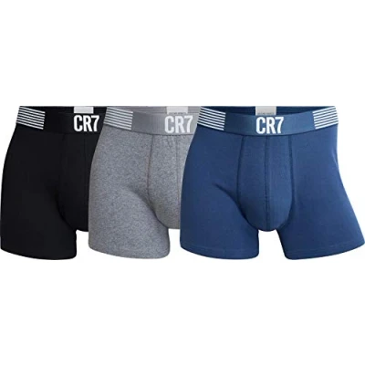 Men’s underwear fit for a soccer superstar! Scoring high in the style and comfort leagues, these three pairs of CR7 Cotton Trunks are made using a stretch jersey 95% organic cotton and 5% elastane mix. These trunks come from Cristiano Ronaldo‘s own clothing brand, so they’re sporty yet fashion-conscious and have up-to-the-minute looks. In a soft feel that’s highly breathable for cool comfort, and constructed for a structured, supportive build, the trunks in this multipack have smooth, soft elastic waistbands with the CR7 logo. With the perfect all-rounder fit, whether you’re out on the football pitch, enjoying a big screen game at the bar or just sat watching TV lounging at home, these boxers are designed to perform and built for it too.