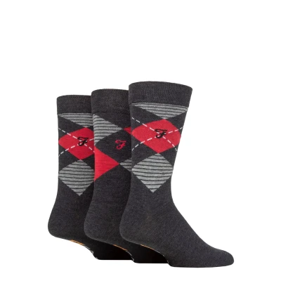 Mens 3 Pair Farah Argyle, Patterned and Striped Cotton Socks Charcoal / Berry Argyle 6 11