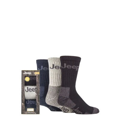In a robust, stylish gift box that perfectly matches its contents, this set of three Jeep Luxury Terrain Socks will be a welcome gift for the man who enjoys outdoor activities.Soft yet durable, these durable, Cotton rich heavyweight socks are ready to be put through their performance paces, with a thickly ribbed ankle and cushioned footbed to help protect the foot and lower leg from abrasion and impact.These attractive socks bear the famous Jeep logo woven into the leg and sole.
