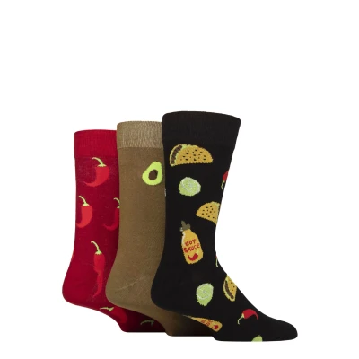 Mens 3 Pair Wildfeet Novelty Patterned Cotton Socks Taco / Avocado Chilli 7 11