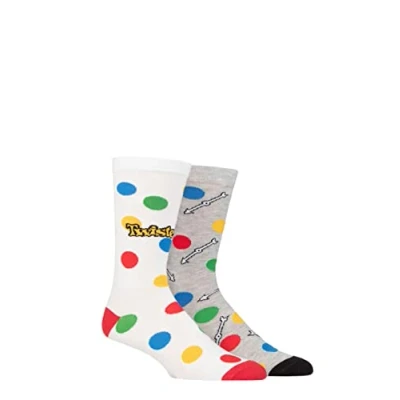 For anyone who loves that classic party game usually played in stocking feet, these two pairs of our SOCKSHOP Twister Cotton Socks are a novelty sock gift set that increases your fun! No need to contort yourself into all kinds of shapes to pull these socks on though — they’re easygoing and easy to wear in a soft, breathable stretch cotton rich blend! SOCKSHOP Twister Cotton Socks are available on both men’s and women's’ sizes, both with the same great twin-pack of designs. The two styles have spinner and logo details, but of course the most eye-catching thing is the multicolour mega-sized polka dots, designed to look just like the ones on the game mat. The socks, in grey and white backgrounds, also have contrast colour toes for extra interest. If you’re an avid Twister fanatic, why not add a fresh challenge to your next game in a supreme test of pose and balance, start barefooted and then try to pull on your Twister socks while you’re mid-move? We take absolutely no responsibility for odd, sock-related injuries or pulled muscles though!