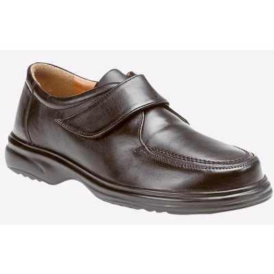 Roamers present these Exeter men's shoes, designed to deliver smart looks and comfortable wear with a black leather upper, touch fastening closure, and a durable rubber outsole.- Leather upper - Touch fastening closure - Apron front silhouette - Fuller fitting design - Lightweight PU Sole