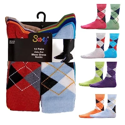 BRIGHT COLOUR ARGYLE DESIGN SOCKS: Update your sock collection with these bright and colourful Argyle design socks by Soxy. Cotton rich material, ideal for every day use. Perfect for work or casual wear, step into style with these snazzy socks. 12 PACK: Put some colourful fashion on your feet with this great value 12 pack of socks from Soxy. Giving you a different pair for every day of the week with some spares! You will receive at least 10 different colours as per images COTTON RICH: Cotton Rich Breathable Socks, Lightweight and Soft Top welt for extra comfort, 80% Cotton, 17% Polyester and 3% Spandex SHOP THE SOXY COLLECTION: Complete your wardrobe with our other Soxy products - Coordinating products and accessories available. UK SHOE SIZE: Available in UK Sizes 6-11 (EU 39-45)