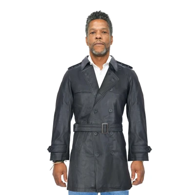 This is a contemporary take on the trench coat style, which gained popularity amongst soldiers during WWI due to its durable and protective qualities. We feature an adjustable belt to achieve tapering at the waist and to provide a modern look to this classic style, as well as shoulder epaulettes which make this piece reminiscent of traditional military style jackets. The jacket front is double breasted and has a three-button fastening with additional buttons on the upper yoke to fasten the wide notch lapel. This jacket also includes a rear vent for ease of movement and button fastened adjustable cuffs. • 100% premium ultra-soft nappa leather • Two angled waist pockets and two interior storage compartments • Adjustable waist belt and cuffs to allow customisation on fit • Features shoulder epaulettes and wide notch lapel