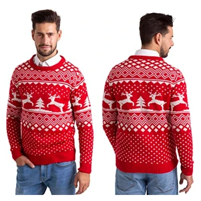 Mens Christmas Jumper Xmas Tree & Reindeer Fairisle Pattern Long Sleeve Knit Crew Neck Sweater S XXL (Red, S)