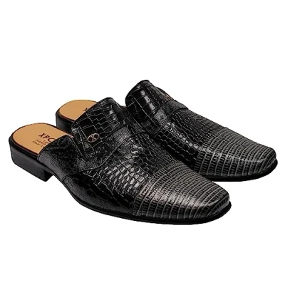 Mens Classic Backless Shoes Snakeskin Effect Real Leather Slip on Half Loafers Mules [ M139 692 GRAY BLACK 42 ]