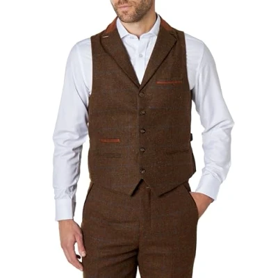 Mens Classic Tweed Waistcoat 1920s Vintage Styled Herringbone Check Collar Vest Tailored Fit [AMZCH CWC VITORI A1 BROWN 48]