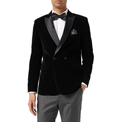 Mens Double Breasted Velvet Dinner Jacket 2 Button Tailored Fit Suit Tuxedo Blazer [BLZ WILLS BLACK 42]
