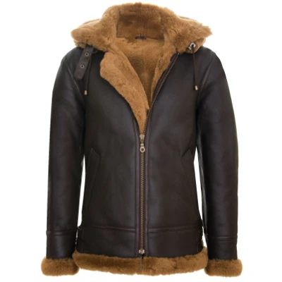 Men's Genuine Ginger Brown Leather Sheepskin Flying Hooded Bomber B3 Aviator Pilot Jacket 3XL