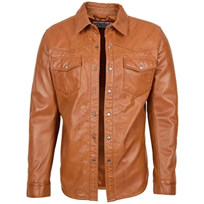 Mens Real Leather Shirt Classic Western Trucker Style Oliver (L, Tan)