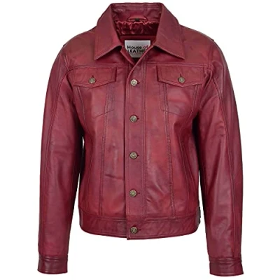 Mens Real Leather Trucker Jacket Lee Rider Style Terry (2XL, Burgundy)