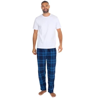 Mens Short Sleeve Pyjamas Set Cotton Rich Top Brushed Fleece Bottoms Pants PJ Pajamas Loungewear/Nightwear Gift (White Large)