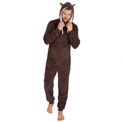 Mens Snuggle Fleece Playsuit Jump Suit All in One Bear Brown M L