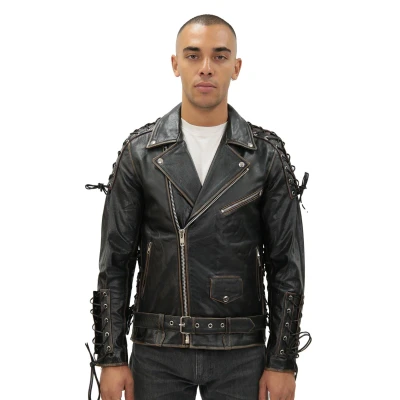 This jacket exudes the vintage “live to ride” biker spirit, exemplified by the embossed Eagle design on the back. The waist, shoulder and cuff have laced adjustable panels to achieve your desired look and feel. This garment is brought to life through the off centred YKK zip front, the wide notch studded lapels and adjustable belt at the waist. Short in length and close fitting, this Vintage jacket embodies the “born to ride” biker spirit. • Classic Brando style • Comfortable Slim fit design • YKK zip front • Stud fastened and zip exterior compartments • Adjustable waist belt • Slanted zipped breast pocket